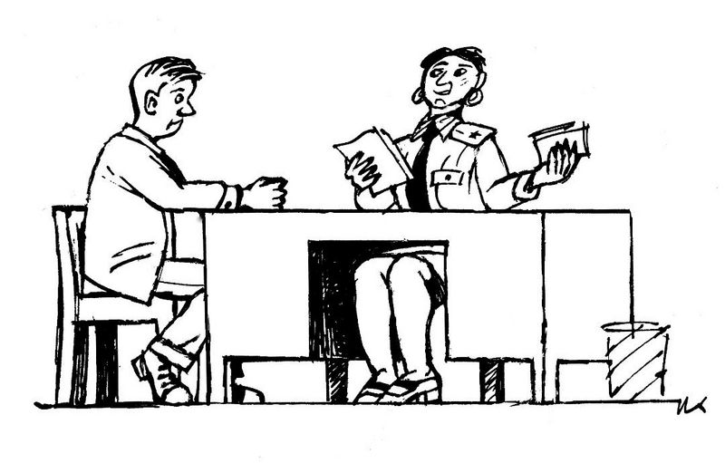 Арнольд не обманул. Действительно, в отделении милиции появилась специальная комната – районное отделение ОВИРа. На двери написано: «Лейтенант Козлова». Миша вежливо стучит и вежливо входит. За столом сидит мрачная, но довольно привлекательная молодая особа в милицейской форме, явно не ожидающая никаких визитов.
