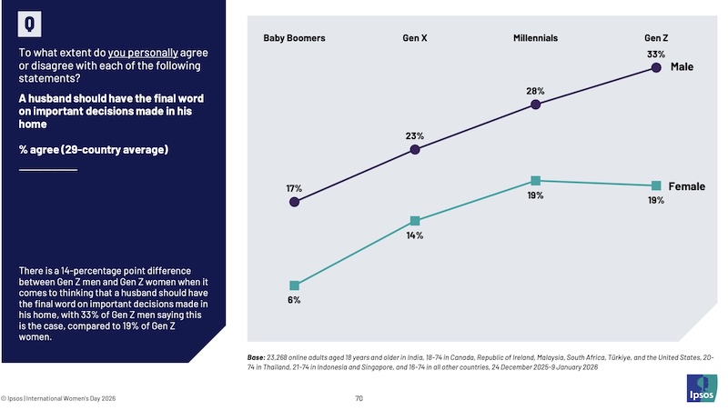 В канун 8 Марта Королевский колледж Лондона провел масштабный опрос, охвативший 29 стран, включая Великобританию, США, Бразилию, Австралию и Индию (к сожалению, мнение россиян не учли). Исследование показало: 31% мужчин-зумеров (поколение Z, рожденное с 1997 по 2010 год) считают, что жена обязана слушаться мужа.