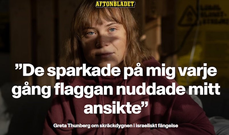 Грета Тунберг, видимо, крайне возмущенная инсинуациями СМИ о мучениях израильтян в плену ХАМАСа, дала огромное интервью шведской газете Aftonbladet, в котором рассказала, что если и есть настоящий ужас, то это тот, который она чудом пережила в сионистских застенках.