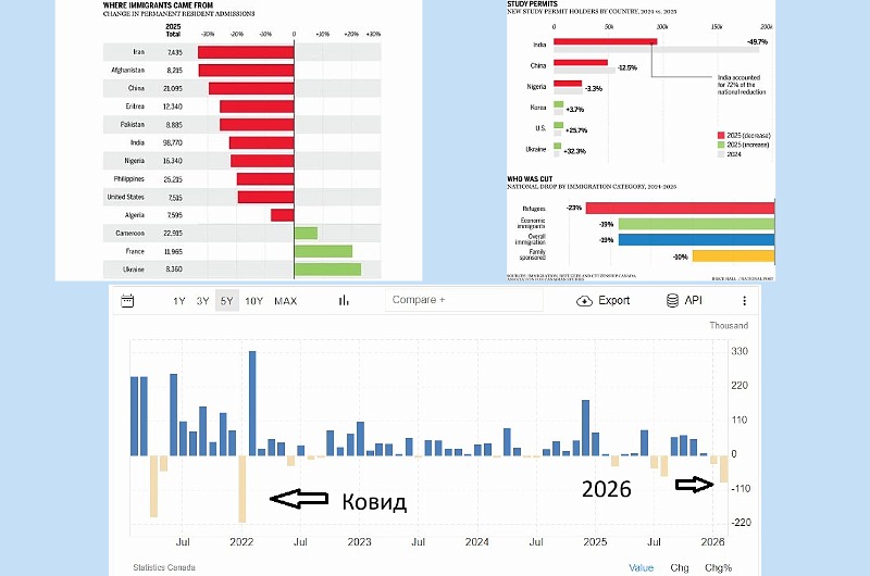 Всего сократили визы для беженцев, экономических иммигрантов и по спонсорской программе. Трудно сказать, приведет ли этот процесс к оздоровлению. Слишком долго страна скатывалась в пропасть – 10 лет при Трюдо, это худшее, что могло случиться с Канадой. Но лучше начать поздно, чем никогда. Тем более, что в феврале рынок труда очень сильно упал. За последние много лет только в период китайского гриппа падение было сильнее, что просто выпадает из правила.