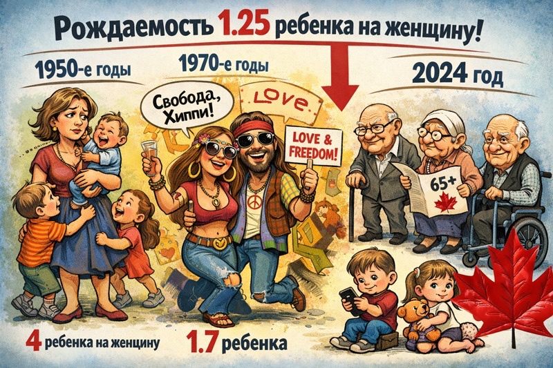 1. В 2024 году коэффициент рождаемости упал до рекордно низкого уровня – 1.25 ребенка на женщину. Для сравнения, в 1950-х годах в Канаде на женщину приходилось около 4 детей. Но следующее поколение в 1970-х воспроизводило уже 1.7 ребенка. Наверняка, это совпадает с той свободой (оборзевшей вседозволенностью) на западе, которую молодежь получила примерно в 1968 году.