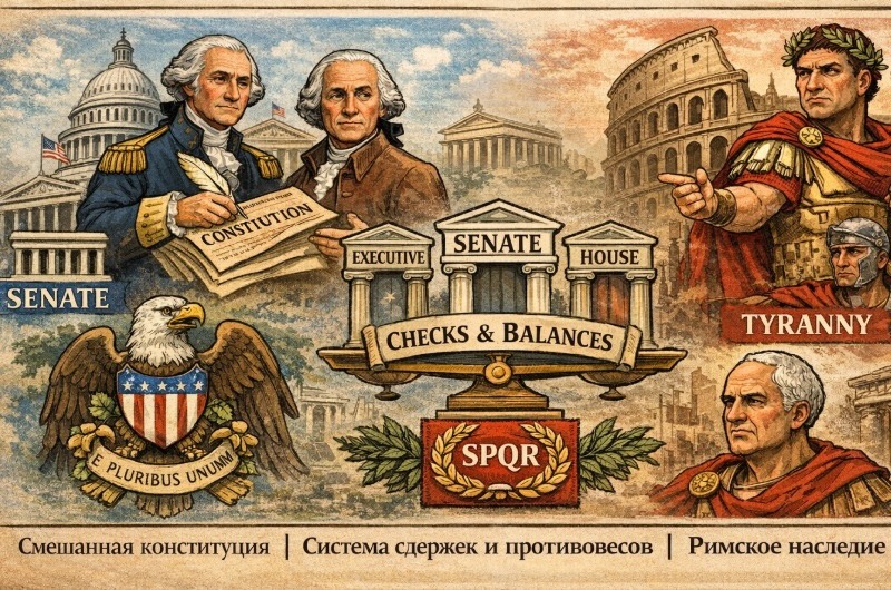 • Смешанная конституция: вдохновлённые Полибием, отцы‑основатели (особенно Мэдисон) стремились сбалансировать монархические (исполнительная власть/президент), аристократические (Сенат) и демократические (Палата представителей) элементы, подобно Римской республике.