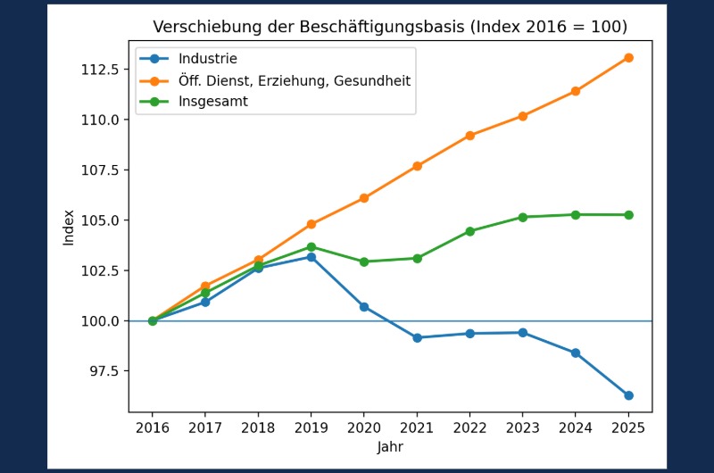 В 2025 г. число занятых в производственной сфере (без учета строительства) сократилось на 143 тыс. до 7,9 млн человек. Число самозанятых также сократилось на 38 тыс. до 3,7 млн. Параллельно с этим число занятых в сфере общественных услуг, образования и здравоохранения выросло на 205 тыс. Общая занятость выглядит стабильной, но это обманчивое впечатление. Решающим фактором является сдвиг: от реального создания добавленной стоимости к административным и финансируемым за счет налогов сферам. Для промышленно развитой страны это чрезвычайно опасно.
