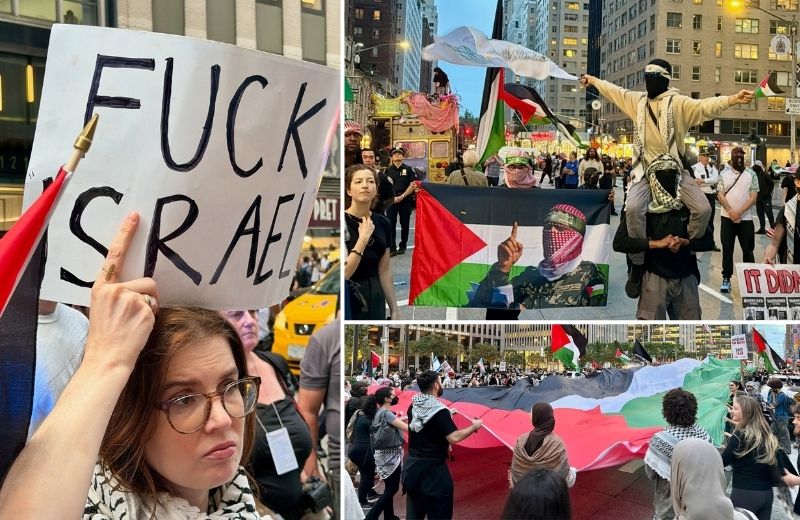 На митинге перед Fox News собрались сотни человек, многие из которых скрывали лица масками или арафатками. Они несли не только флаги Газы, но и откровенно антисемитские плакаты с лозунгами вроде: «From the river to the sea, Palestine will be free» («От реки до моря Палестина будет свободна»), «Globalize intifada», «Long live the intifada» («Да здравствует интифада»), «Fuck Israel» и т.д.