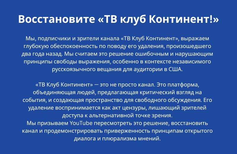 Друзья, пожалуйста, подпишите петицию о возвращении на платформу YouTube нашего удаленного канала ТВ клуб Континент: https://www.change.org/p/bring-back-tv-club-kontinent?lang=en-US