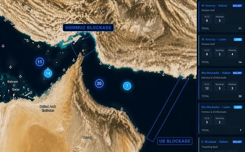 Vortexa, an analytic firm focusing on global energy and freight markets, said it has recorded 34 movements of sanctioned and Iranian-linked tankers in and out of the Persian Gulf in the week after the U.S. imposed its blockade on April 13.