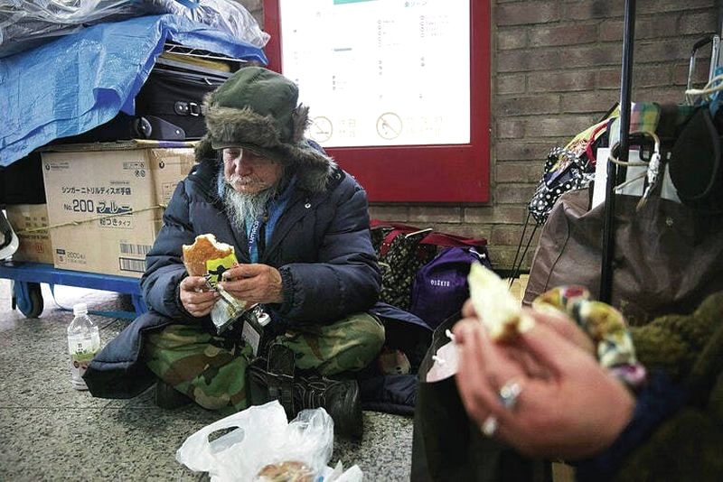 В столице Японии число бездомных упало до рекордного минимума, но они по‑прежнему заметны в центральных районах – в лохмотьях, с бородами, среди картонных лачуг и алюминиевых банок. Некоторые читают «Мадам Бовари» в районной библиотеке.