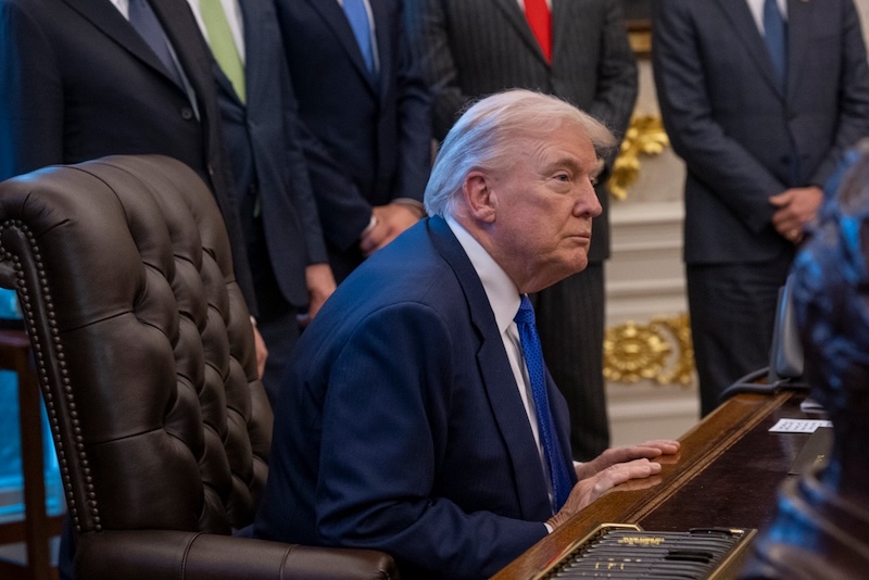 Трамп подписал «Закон о консолидированных ассигнованиях» в Овальном кабинете, находясь в окружении республиканских законодателей, включая спикера Палаты представителей Майка Джонсона (R-Луизиана) и главного помощника большинства в Сенате Джона Баррассо (R-Вайоминг), а также других.